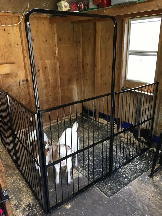 New! Modular Goat and Sheep Pens If you are raising goats or sheep you know the value of a quality pen. Goats have a reputation of being master escape artists in the domestic animal world! If your child is involved in 4-H, a well built pen is a much needed item. Our goat or sheep pen is a modular design that allows you to add and remove panels as your space requirements change. Questions? Call us at 740-694-9926 and we will be happy to assist you. Panel connectors and hardware are included! The door frame is made of 1'' square tube 16ga and the panels are 3/4'' square tube 16ga. The bars are 5/16 round steel measuring 3 inches on center. Each panel is 42''H X 36''W. Simple bolt together design.